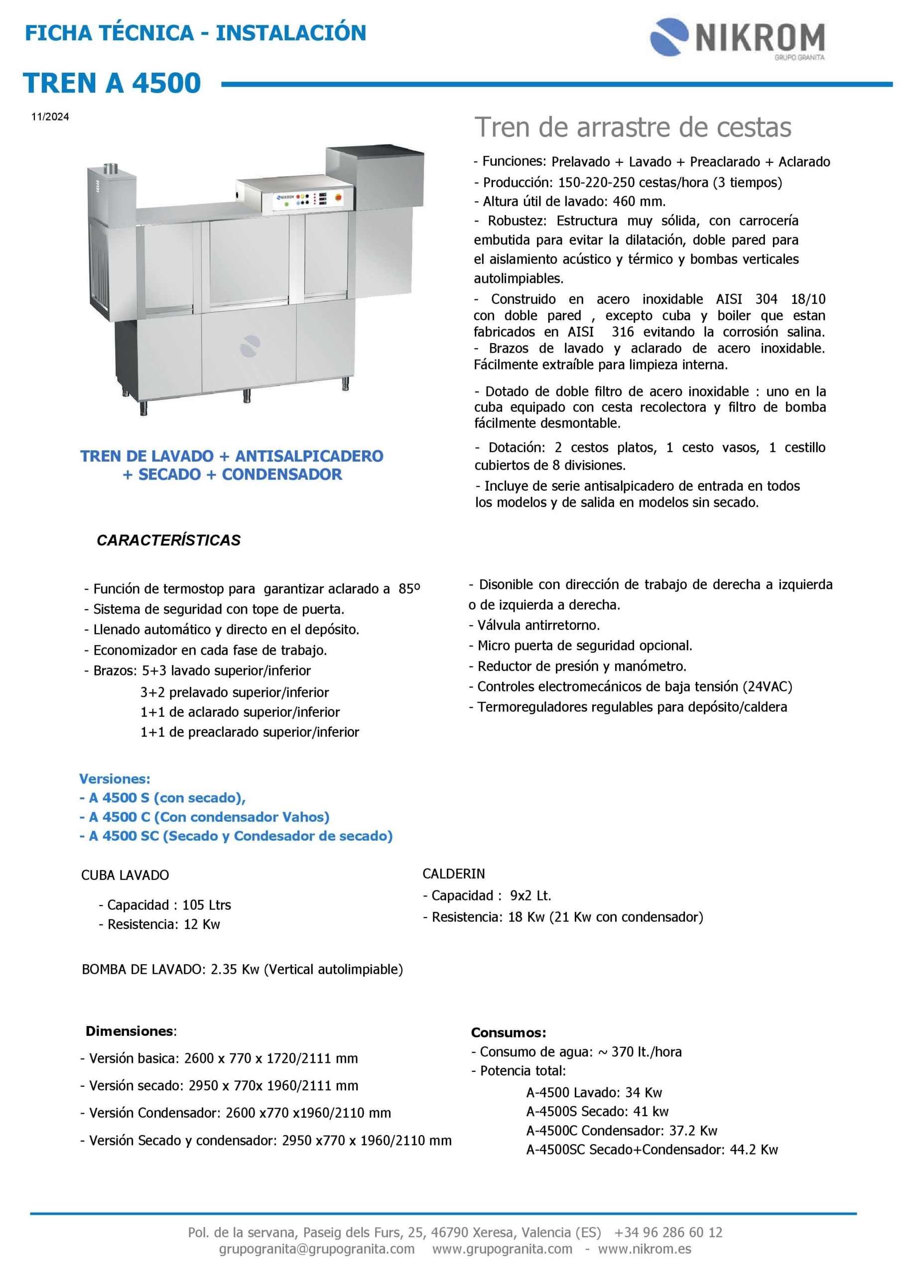 LAVADO: bomba: 2,35 Kw, cuba: 105 litros, resistencia: 12 Kw