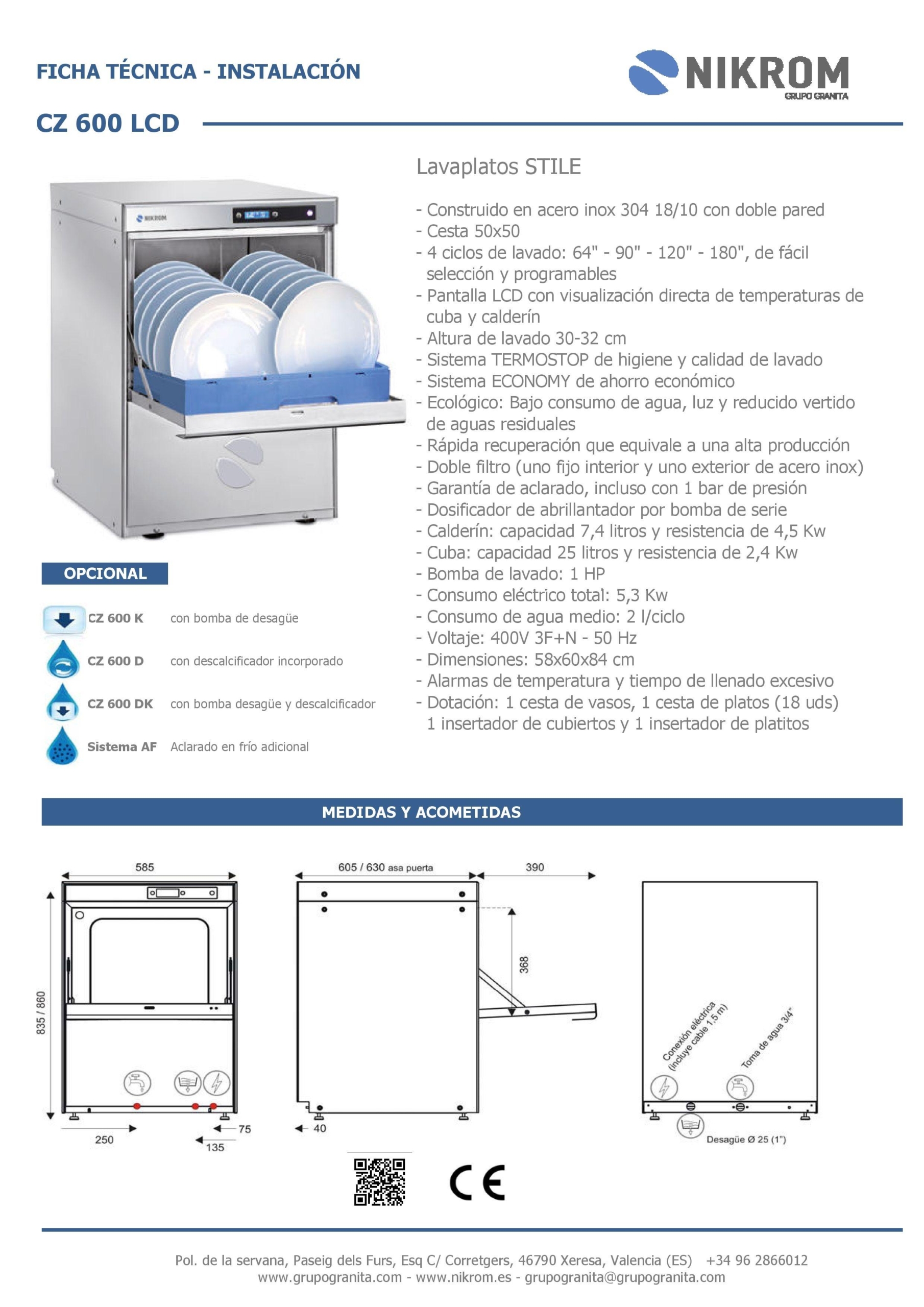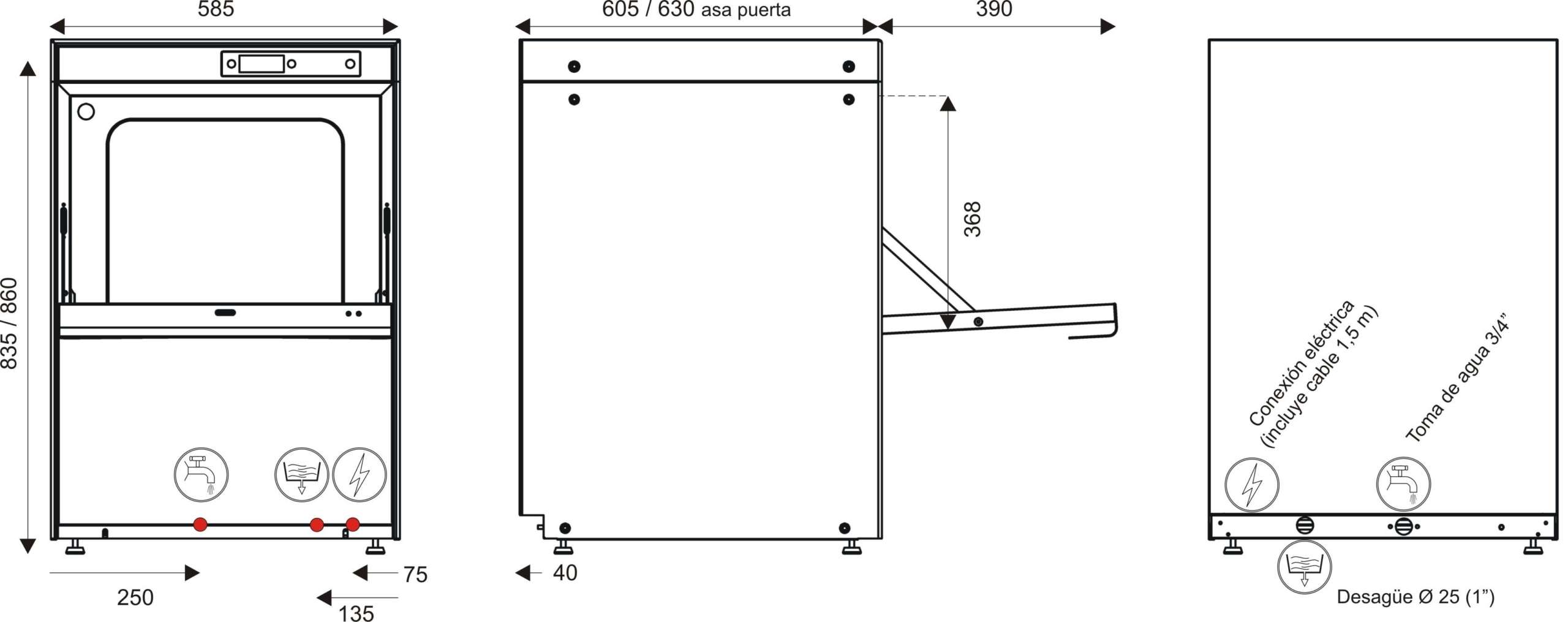 De serie: Termostop, dosificador abrillantador por bomba, micro puerta, antiparasitario, válvula antirretorno y preinstalación de jabón