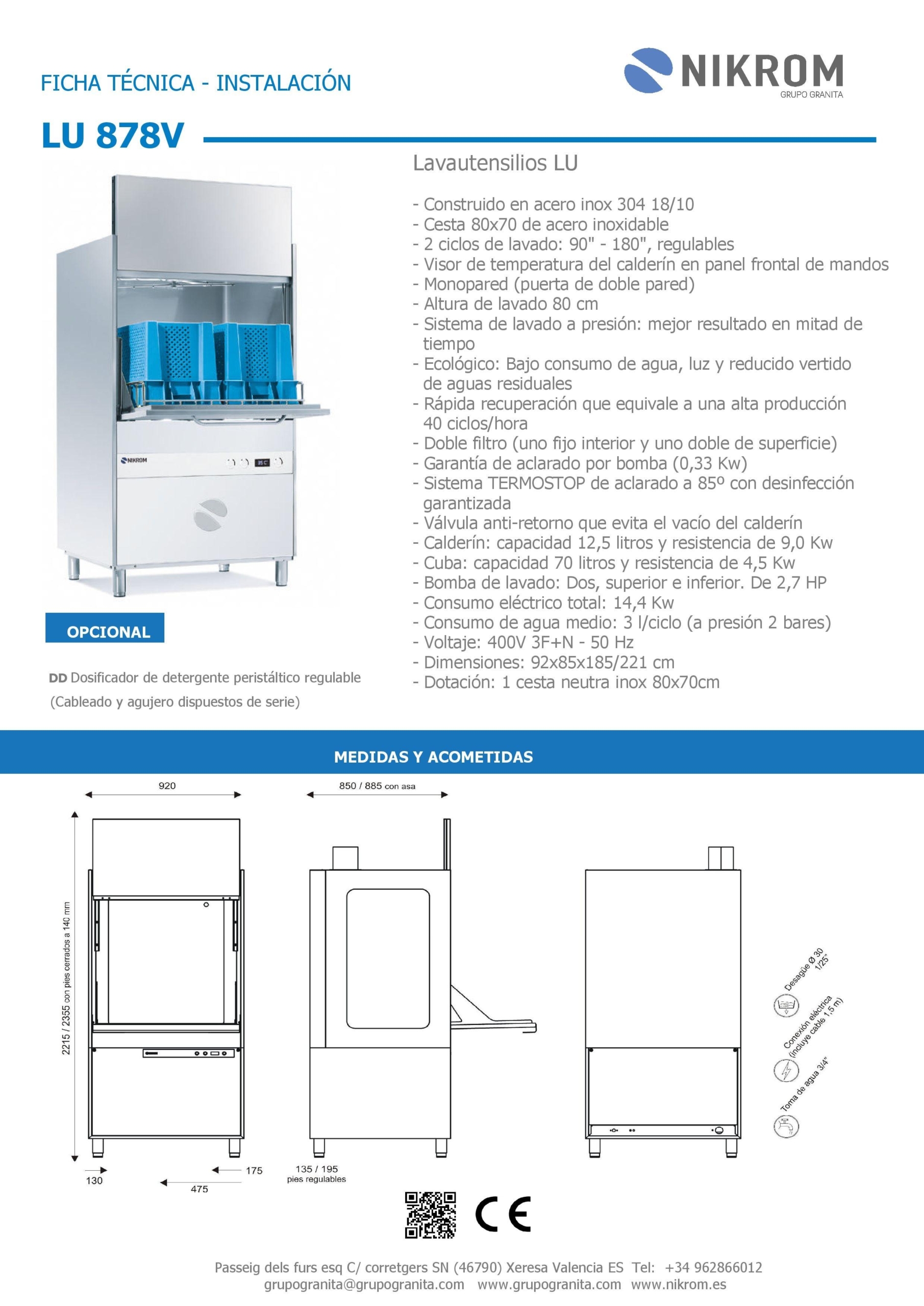 De serie: Start al cierre de puerta, termostop, micro puerta, antiparasitario, válvula antirretorno y preinstalación jabón