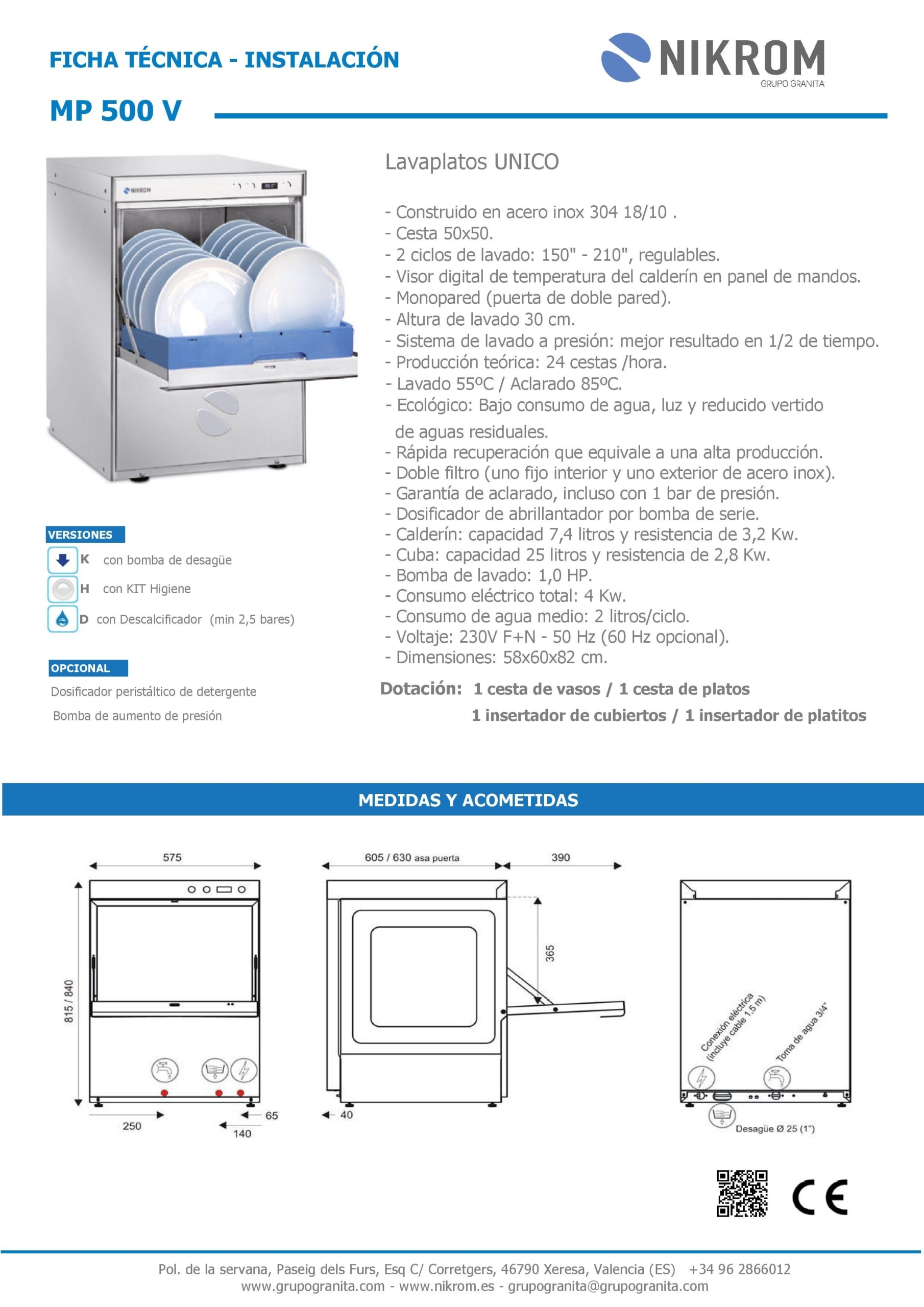 Dotación: 1 cesto vasos,1 platos,1 Insertador cubiertos,1 de platitos