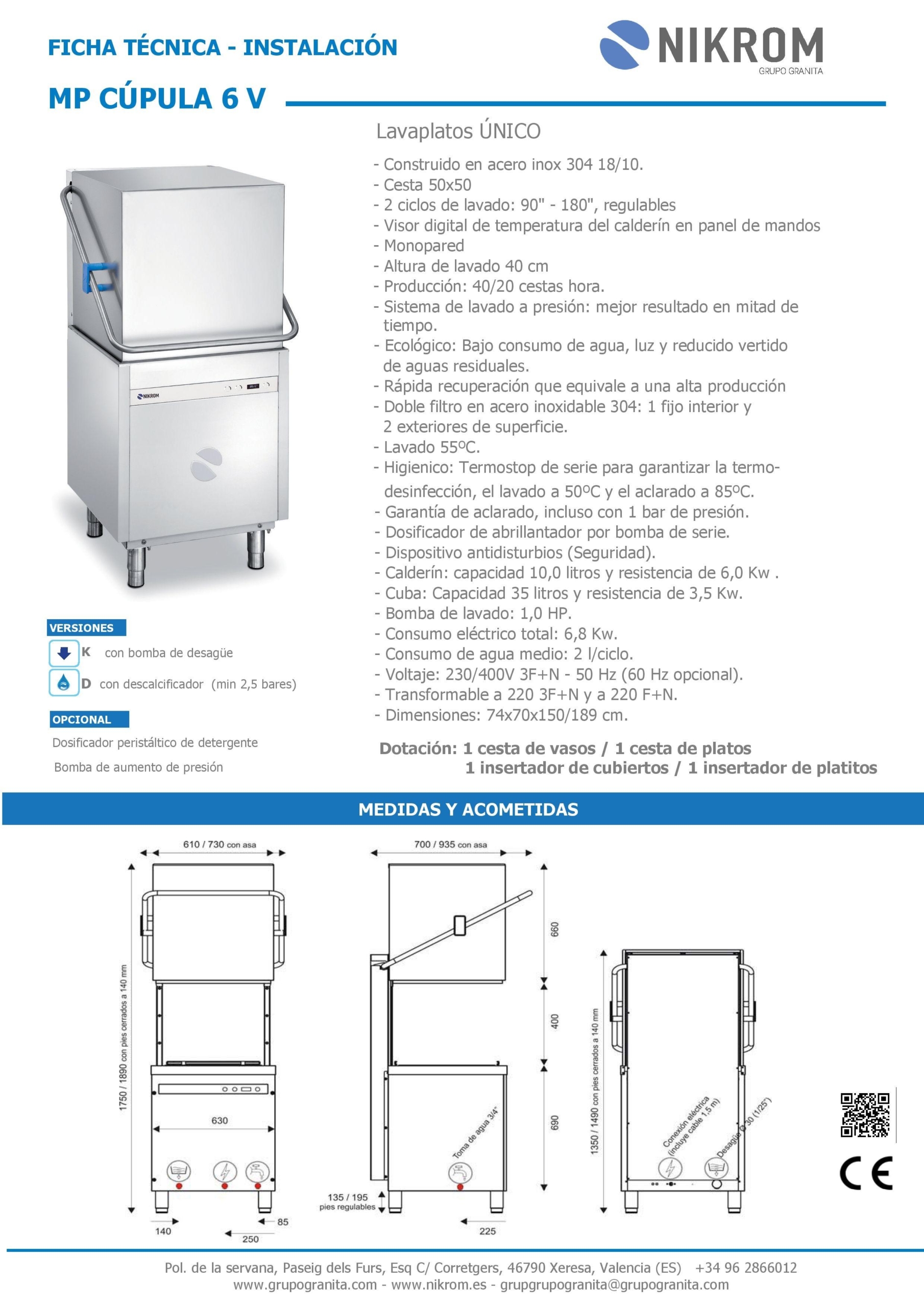 De serie: Start al bajar la puerta, termostop, abrillantador por bomba, micro puerta, antiparasitario, válvula antirretorno y preinstalación jabón