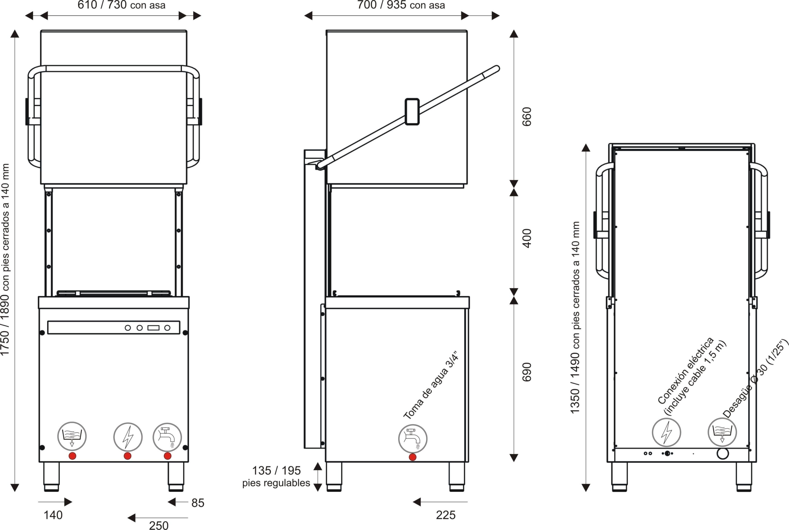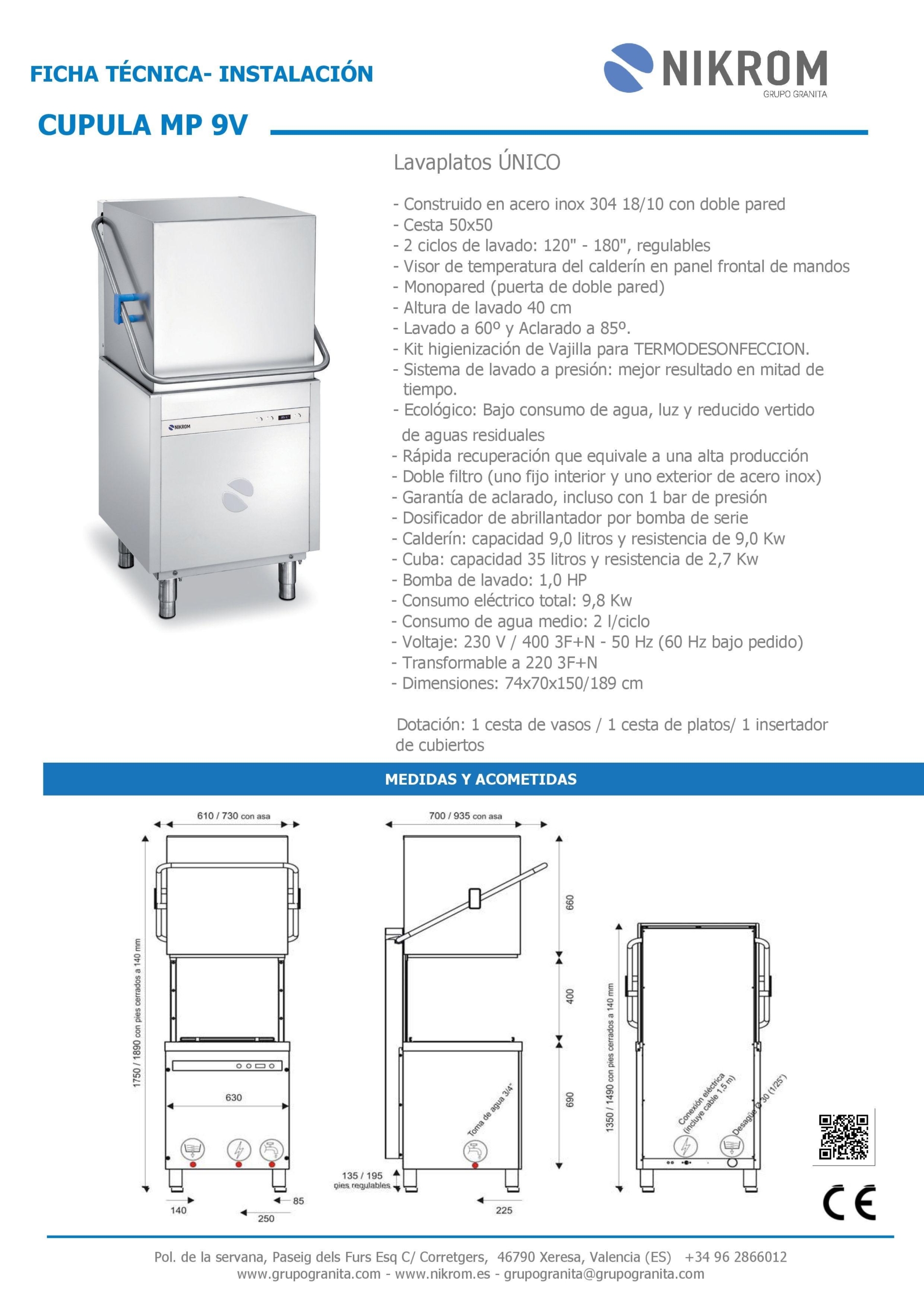 De serie: Start al bajar la puerta, termostop, abrillantador por bomba, micro puerta, antiparasitario, válvula antirretorno y preinstalación jabón